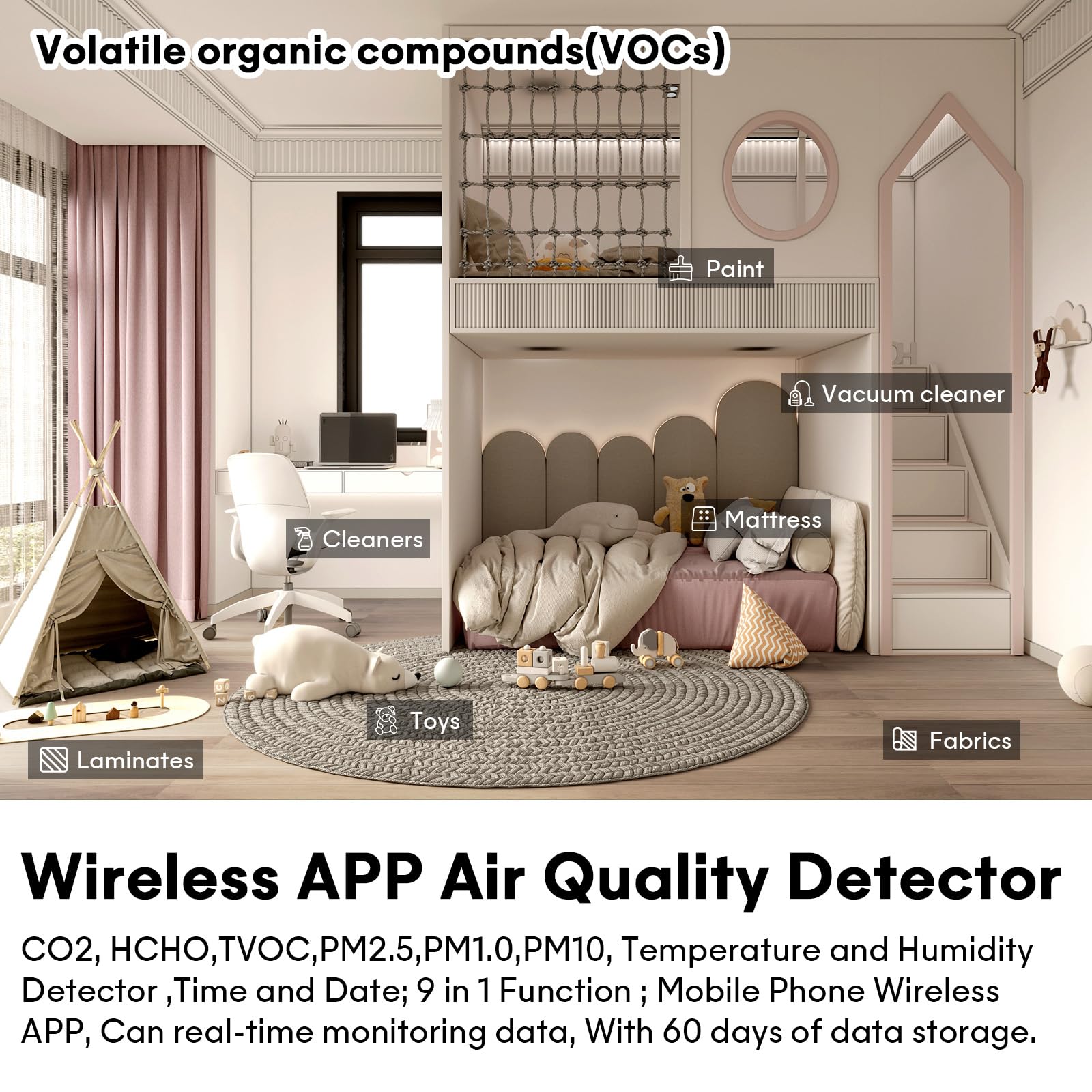 Portable 9-in-1 Indoor Air Quality Monitor for Home, Office, School Detects PM2.5, PM1.0, PM10, CO2, TVOC, HCHO, Temperature & Humidity