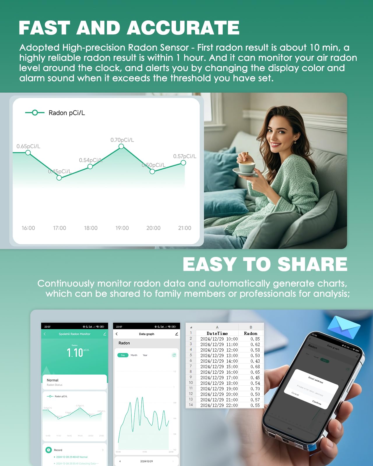 Real-Time Radon Protection for Your Family: Radon is the leading cause of lung cancer in non-smokers, and it’s invisible to your senses. This advanced radon tester offers real-time detection and WiFi data transmission, ensuring you’re always informed and protected. Don’t wait—safeguard your loved ones today!