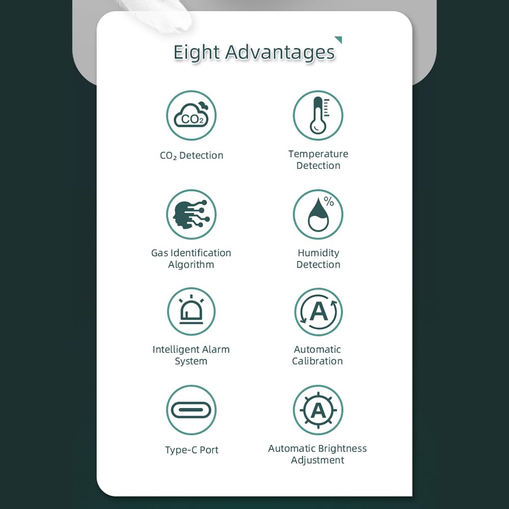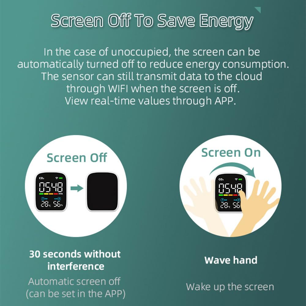 Clear LED Display for Easy Readings:The large, full-color LED screen clearly shows CO2, temperature, and humidity levels, ensuring easy visibility and eye comfort.