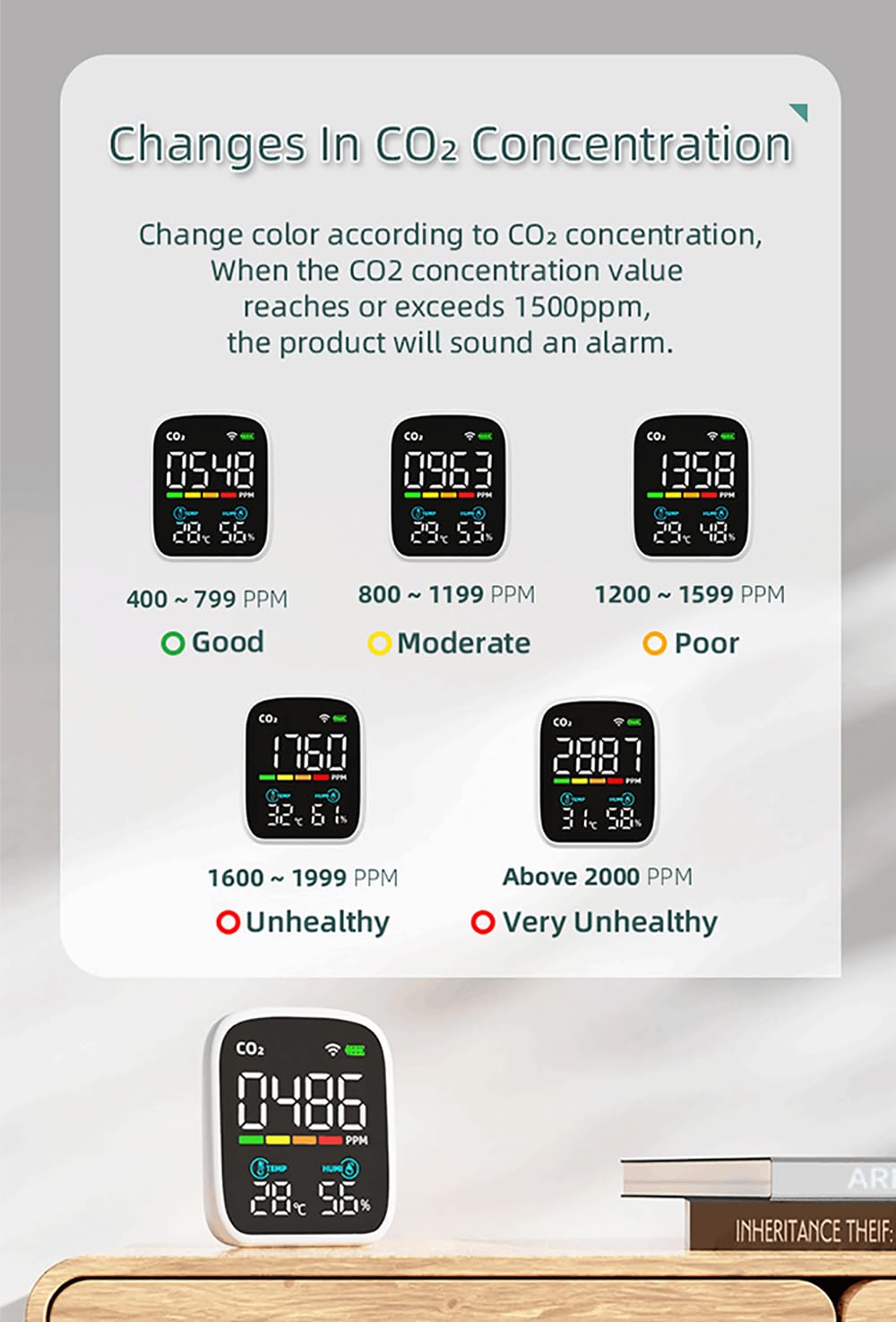 5-Stage CO2 Monitoring with Alarm:Tracks CO2 levels across 5 stages (Good to Very Unhealthy). Alarms when levels exceed 1500 ppm, helping you maintain healthy air quality.