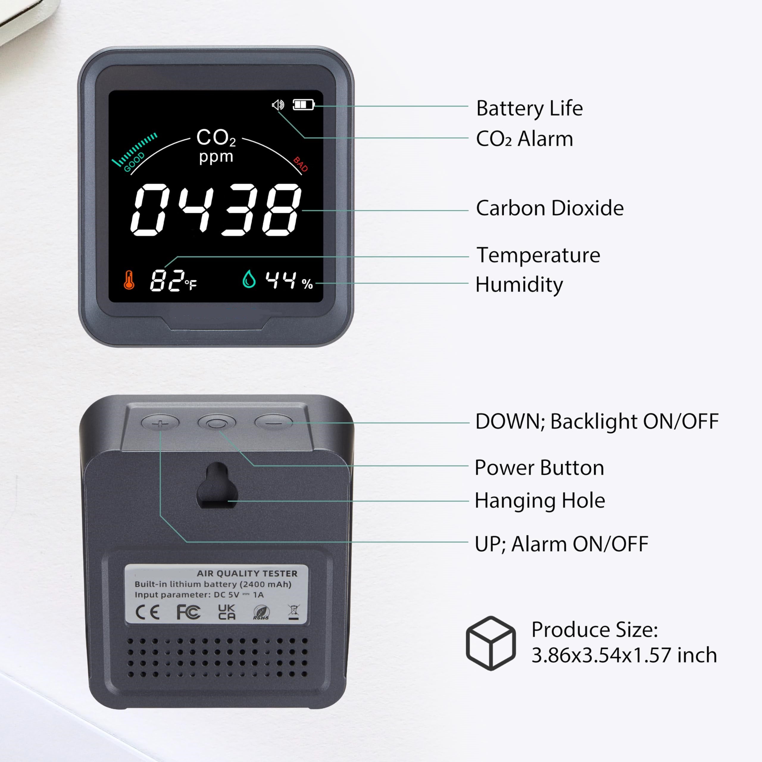 Indoor Carbon Dioxide Detector for Home, Grow Tents, Wine Cellars, Cars Best CO2 Detector with Alarm